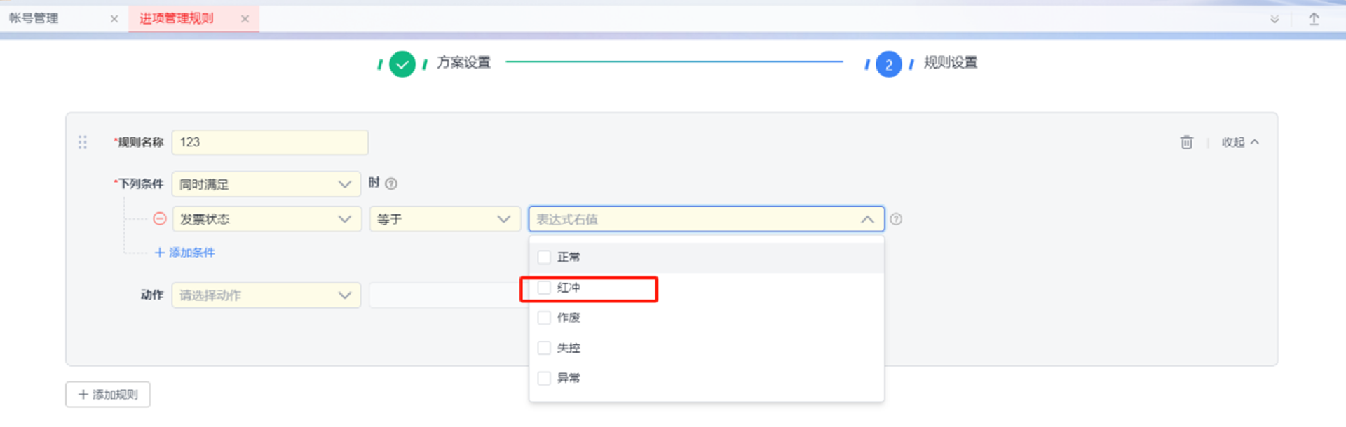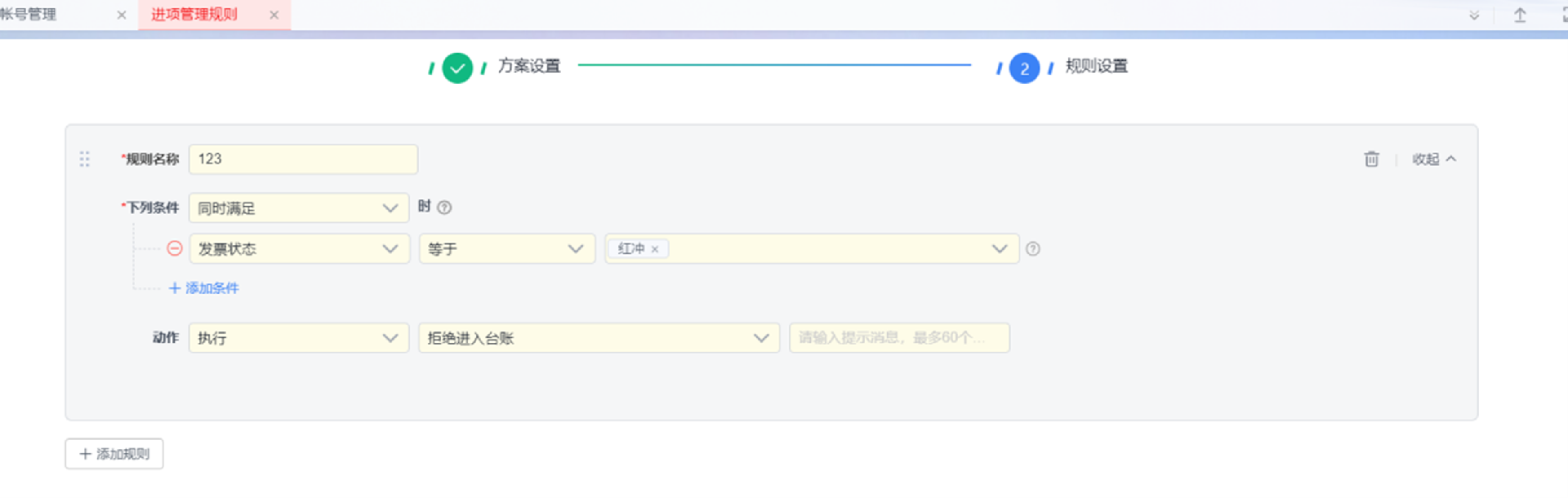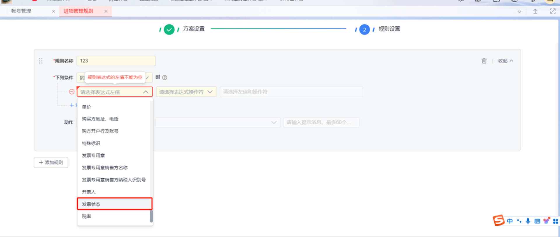 填写规则名称,添加校验条件,选择发票状态