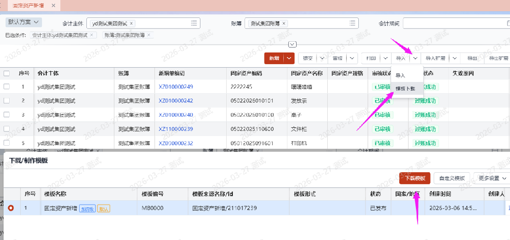 进入【固定资产新增】节点,点击导入按钮下的【模板下载】,下载导入模板