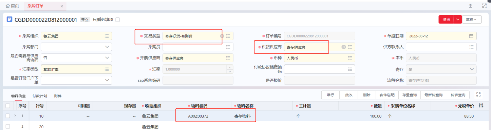 Step1:创建采购订单,依次维护采购组织、交易类型、供货供应商、币种、物料信息等信息,交易类型选择“寄存订货-有到货”维护完成后点击【保存】按钮