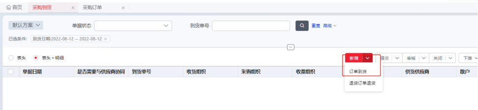 Step1:参照采购订单,新增订单到货