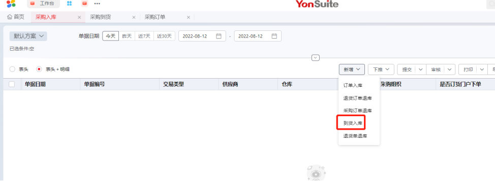 Step1:参照到货入库,新增采购入库单