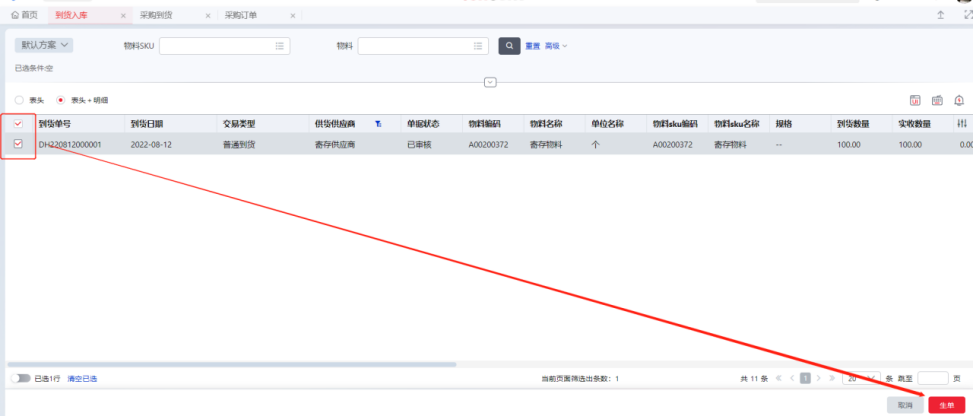 Step2:选择需要入库的采购到货单,点击【生单】