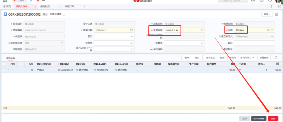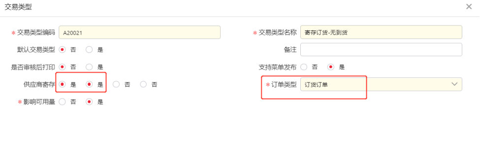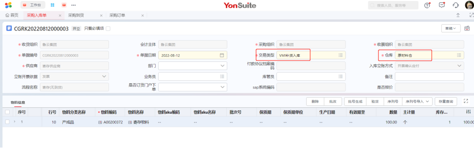 采购订单交易类型为“寄存订货-有到货”,采购入库单交易类型选择“VMI补货入库”