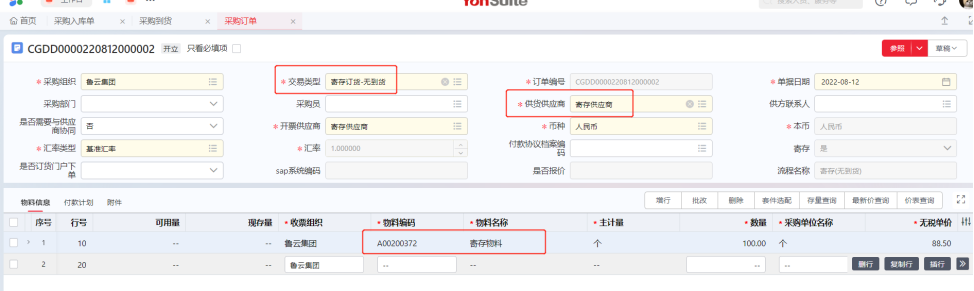 采购订单:系统预置“寄存订货-有到货”和“寄存订货-无到货”