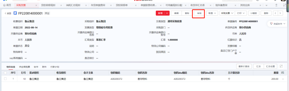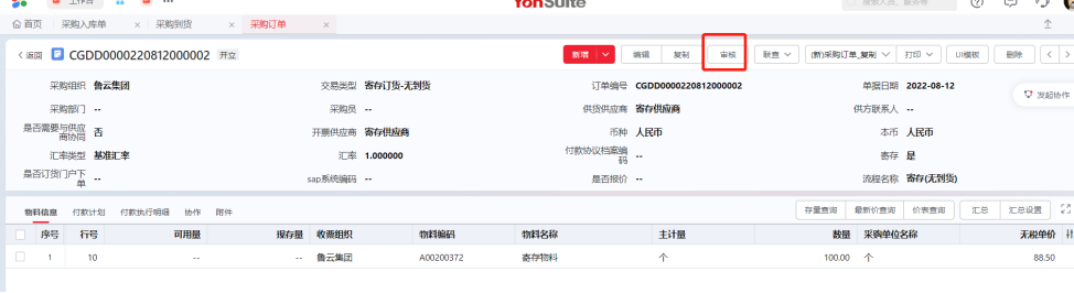 Step2:点击【审核】按钮,完成对该单据的审核。