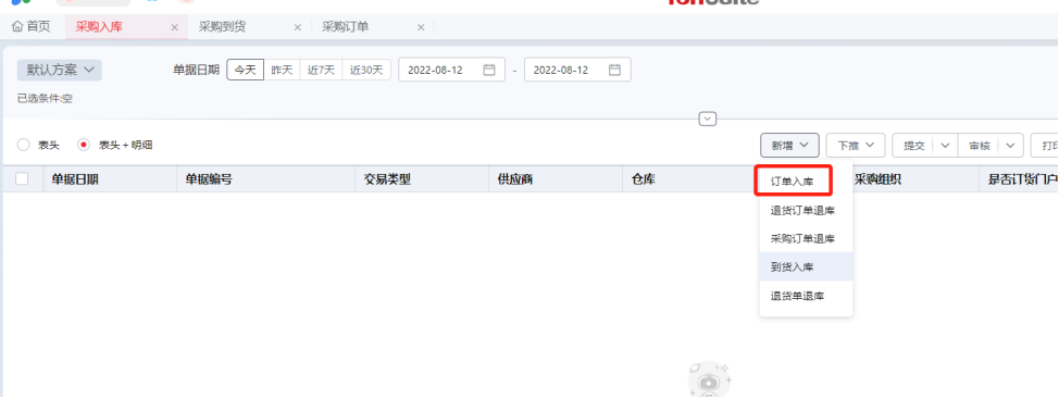 Step1:参照订单入库,新增采购入库单