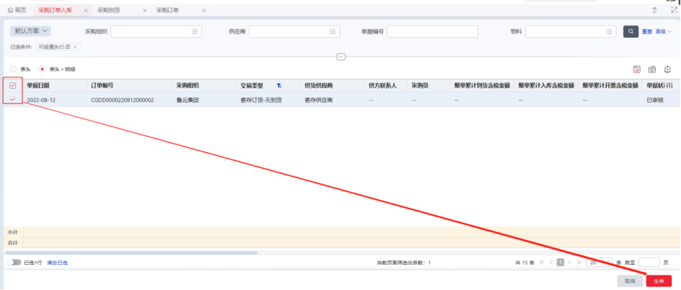 Step2:选择到货的采购订单,点击【生单】