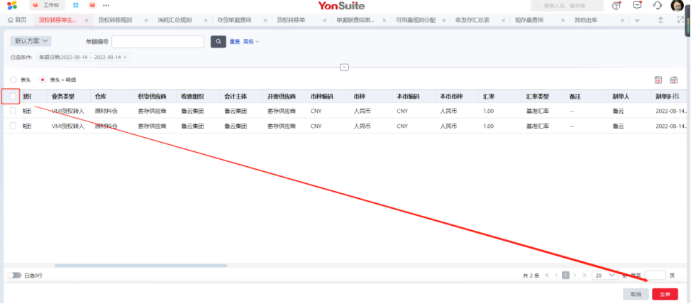 Step2:选中货权转移单,点击【生单】