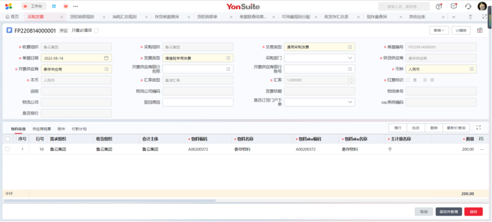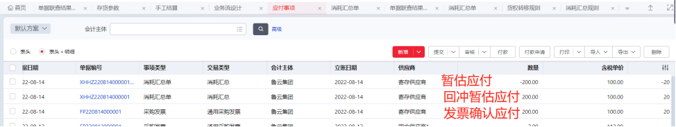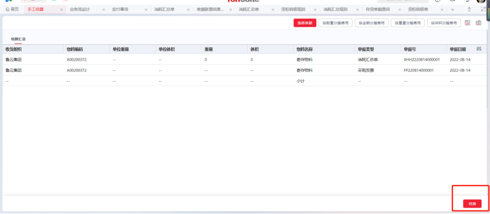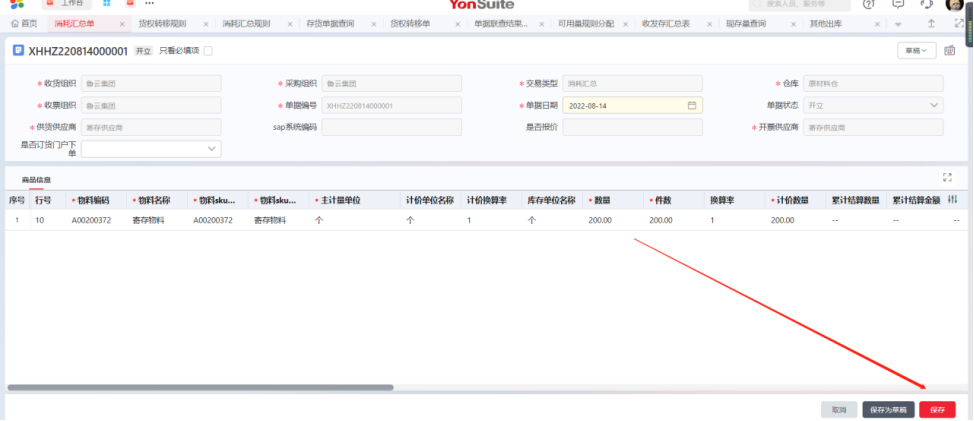与供应商进行结算时进入消耗汇总单节点,参照货权转移单新增消耗汇总单