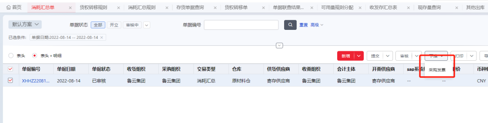 Step1:消耗汇总单审核后,选中消耗汇总单下推采购发票